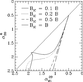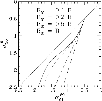 Figure 5. Loci in the colour-colour plane for random field KP model radio spectra, for the set of frequencies (6, 20, 91) cm. Four curves are shown in which the importance of inverse Compton losses varies, as given by the ratio of the inverse Compton equivalent field B_IC to the rms field strength B.